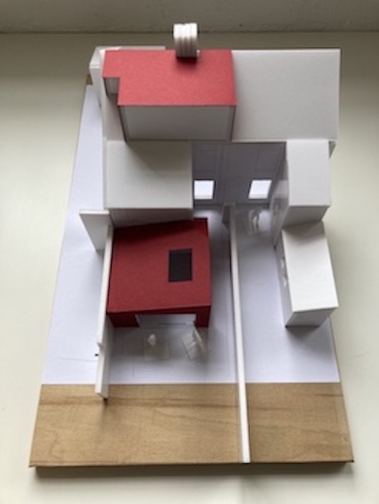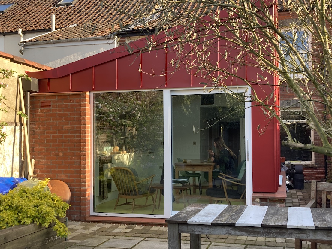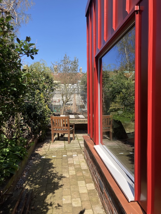 The distinctive choice of the red colour follows consideration of the original Victorian-era duality of the house: to the front - to the public face - the smarter, more expensive materials of buff brick, stone and grey slates (neutral, light colours); whereas to the rear - the private realm - the cheaper, basic materials of red-brick and terracotta pantiles (red/orange/brown in colour). The red zinc continues this two-tone language.