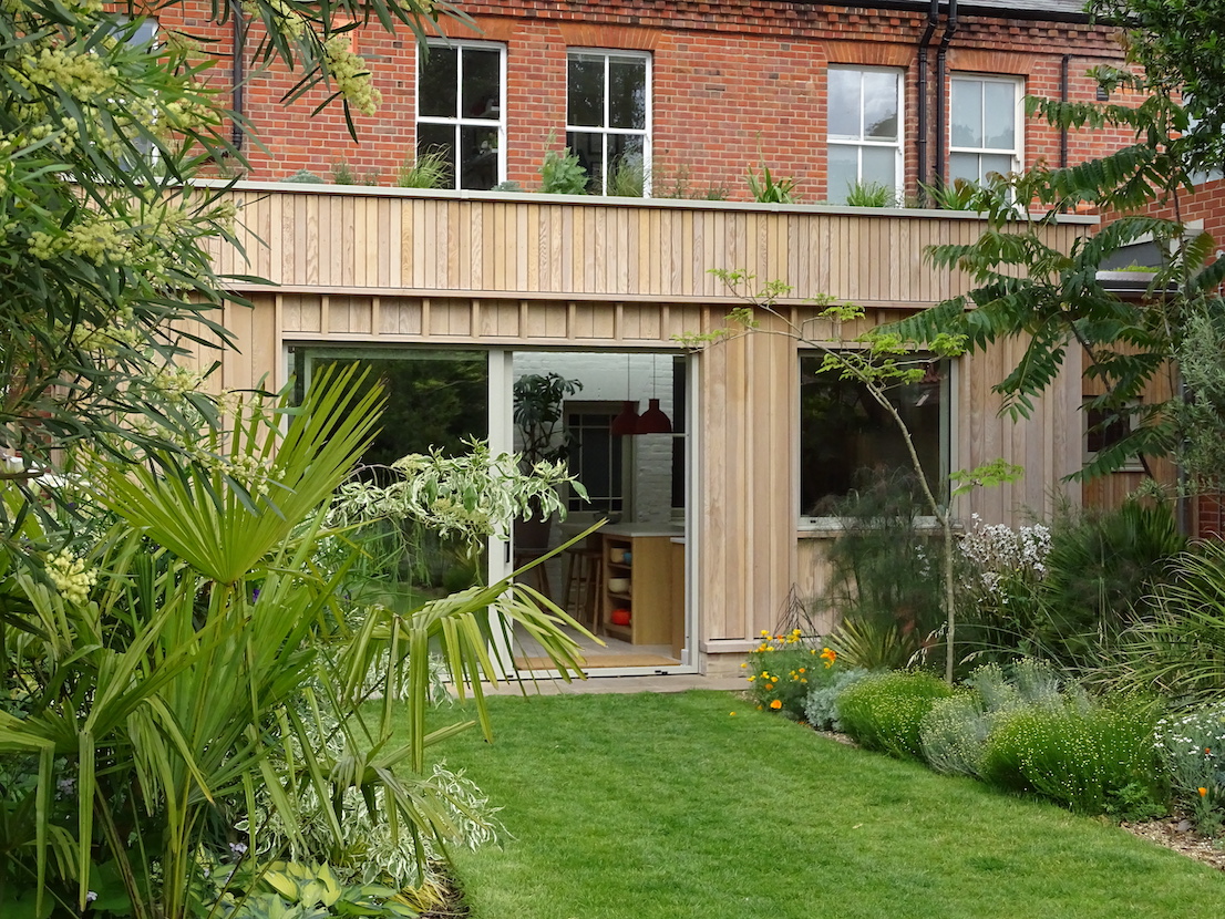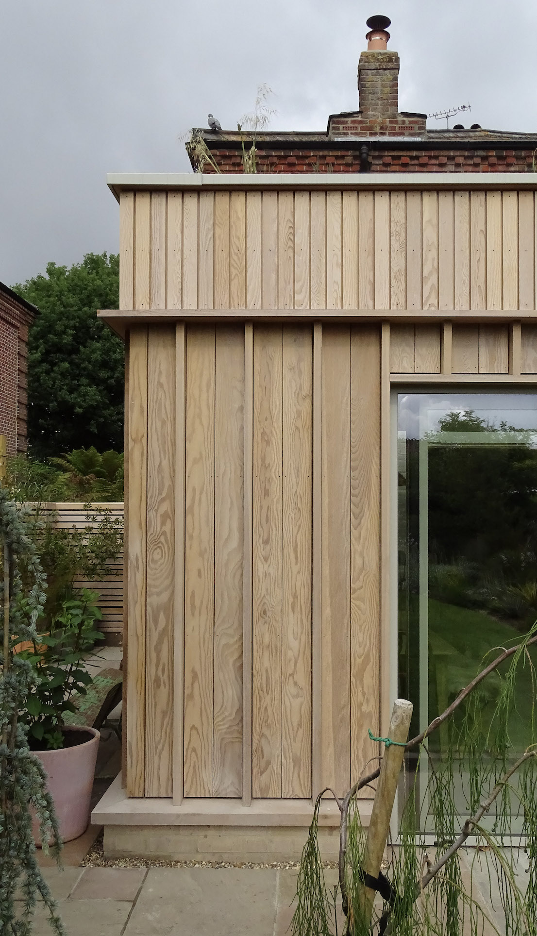 Externally, the extension is clad in Douglas fir, using timber in reference to garden structures, detailed to create texture and interest, and constructed to a high level of craftsmanship.