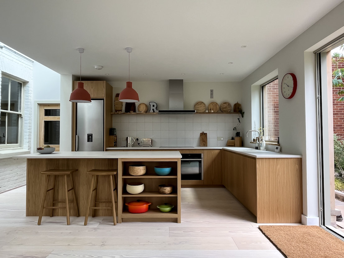 A single-storey rear extension to a private house in Norwich, to create a new kitchen and dining room, with a pantry and storage, and modifications to the existing house to create a new WC. As is typical of Victorian houses, the original kitchen was small, impractical to work in and with very little visual connection or access to the garden – which is a real passion for the client.