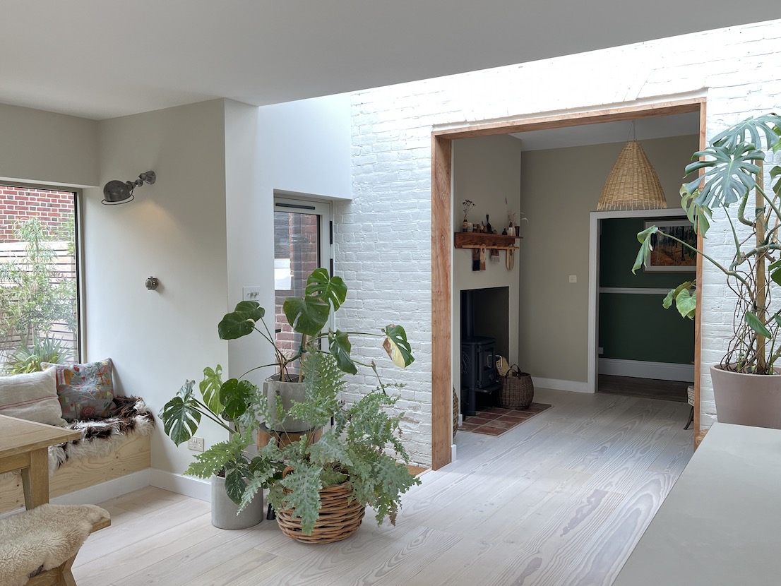 The project made minimal changes to the existing house, working with what was already there, to keep costs and disruption low; just widening one door opening, infilling another and then opening up the external wall to lead into the new space. Even the existing external door and window to the Utility Room were retained, becoming internal within the extension. A fully glazed rooflight along the rear of the extension, between the new roof and the original house, ensures excellent natural light throughout the space, and which highlights the texture of the original brickwork.