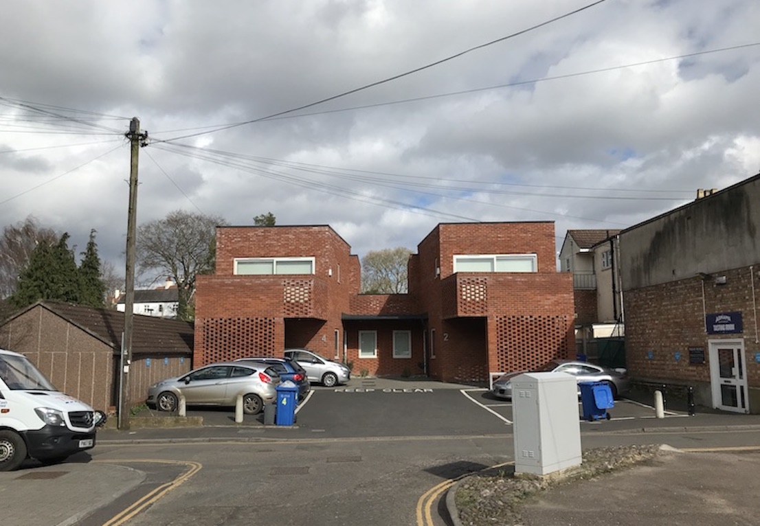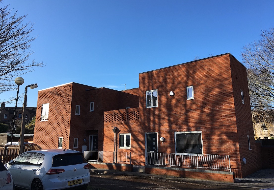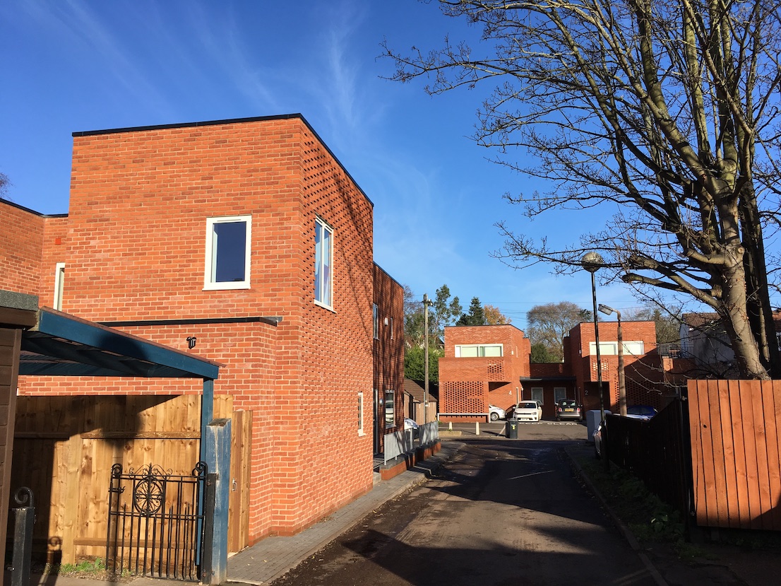 This design was for four new dwellings on two separate sites stranded awkwardly between the backs of a set of main road-shops and a run of terraced cottages.